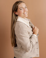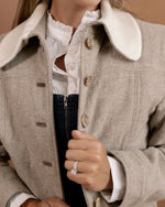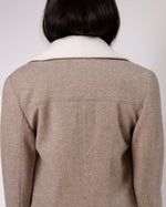 Soft organic fleece collar Cropped length Sewn in Saratoga Springs, NY 100% wool in light brown herringbone, woven in North America Two front pockets, one interior pocket Fully lined with 100% Rayon woven in Japan...